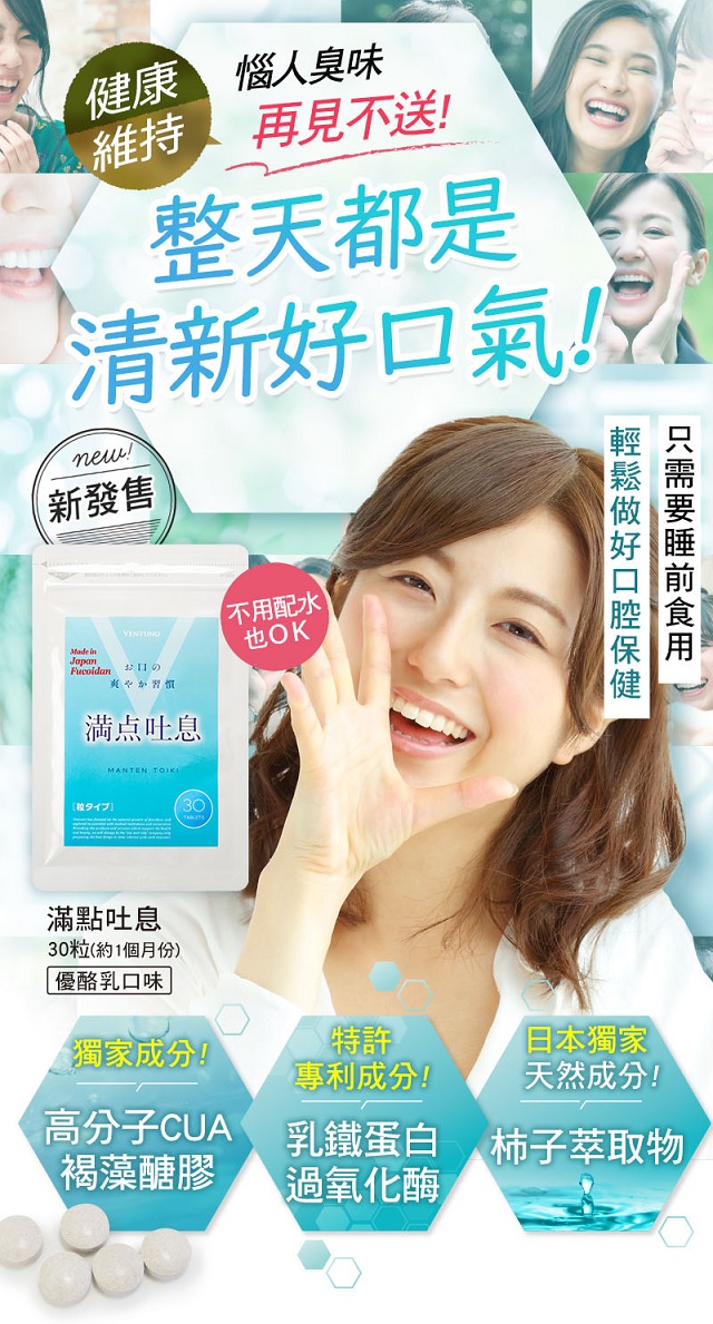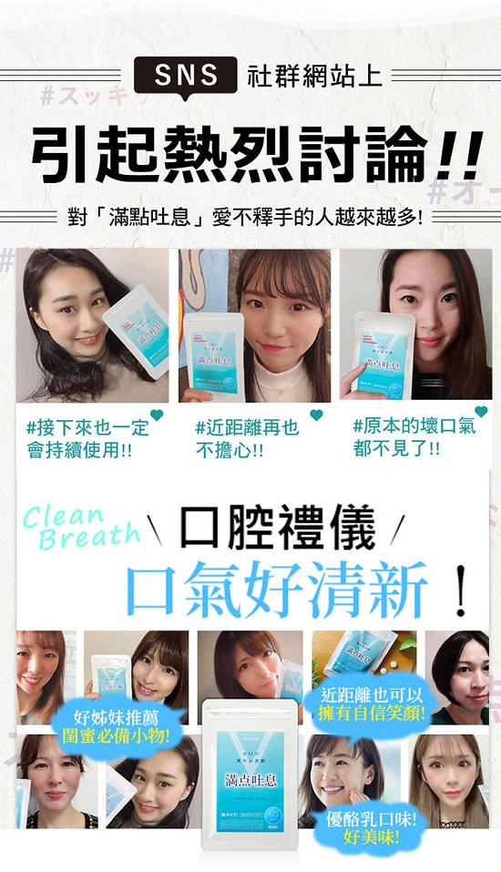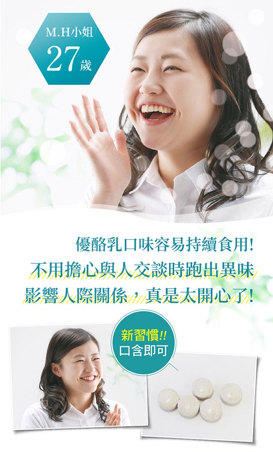 我試過了各種方法想要消除口臭,認為口臭保健食品是最有效的。1整天都不會有口臭。真是太厲害了!